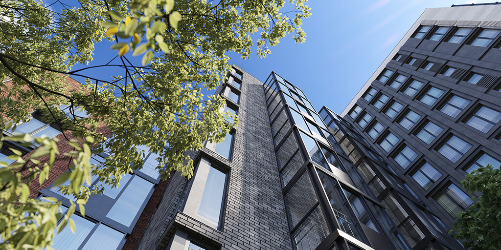 Разновысотное здание выполнено по кирпично-монолитной технологии с использованием натурального кирпича, искусственного камня и декоративных панелей. Навесные вентилируемые фасады в терракотовых и графитовых оттенках создают благородную текстуру и подчеркивают статус проекта. Архитектурная подсветка усиливает пластику фасадов и формирует выразительный вечерний образ.